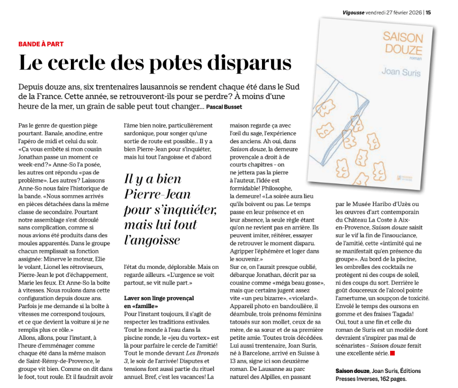 « Saison douze saisit sur le vif la fin de l’insouciance, de l’amitié, de cette «intimité qui ne se manifestait qu’en présence du groupe» […] Oui, tout a une fin et celle du roman de Suris est un modèle dont devraient s’inspirer pas mal de scénaristes – Saison douze ferait une excellente série » – Pascal Busset, Vigousse